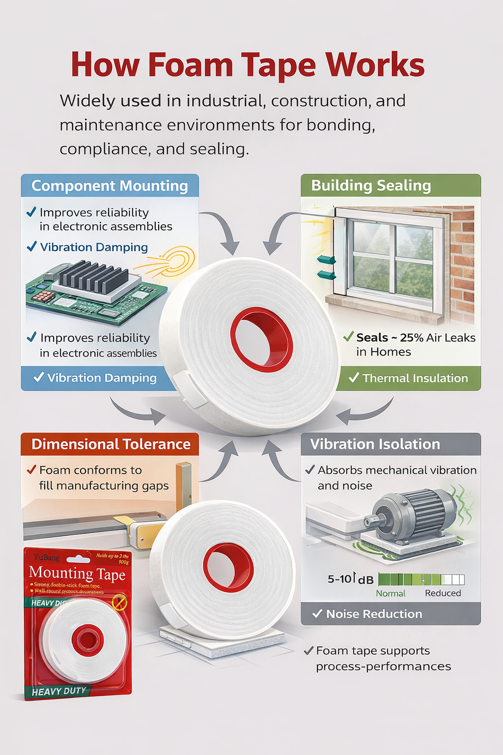 في الصيانة والتطبيقات الوظيفية، يتم استخدام الشريط الرغوي بشكل متكرر لعزل الاهتزازات وتقليل الضوضاء وحماية السطح. عند وضعها بين المكونات المتلامسة، تعمل طبقة الرغوة كوسيط تخميد يحول الطاقة الميكانيكية إلى حرارة. تشير القياسات الصوتية في البيئات المنزلية والصناعية الخفيفة إلى أن واجهات الرغوة المتوافقة يمكن أن تقلل من ضوضاء التلامس بمقدار 5 إلى 10 ديسيبل، اعتمادًا على سمك المادة وكثافتها.